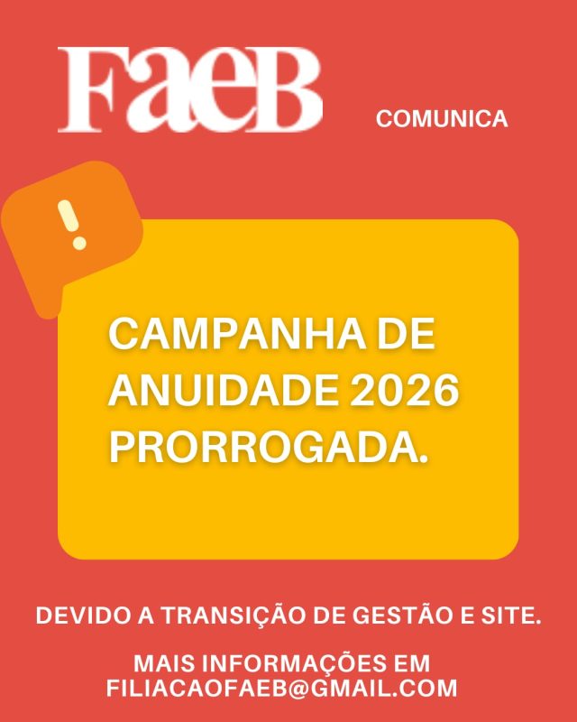 Informamos que, em razão da atualização do site da FAEB, a renovação da filiação individual e das associações estaduais foi prorrogada até 31/03/2026.